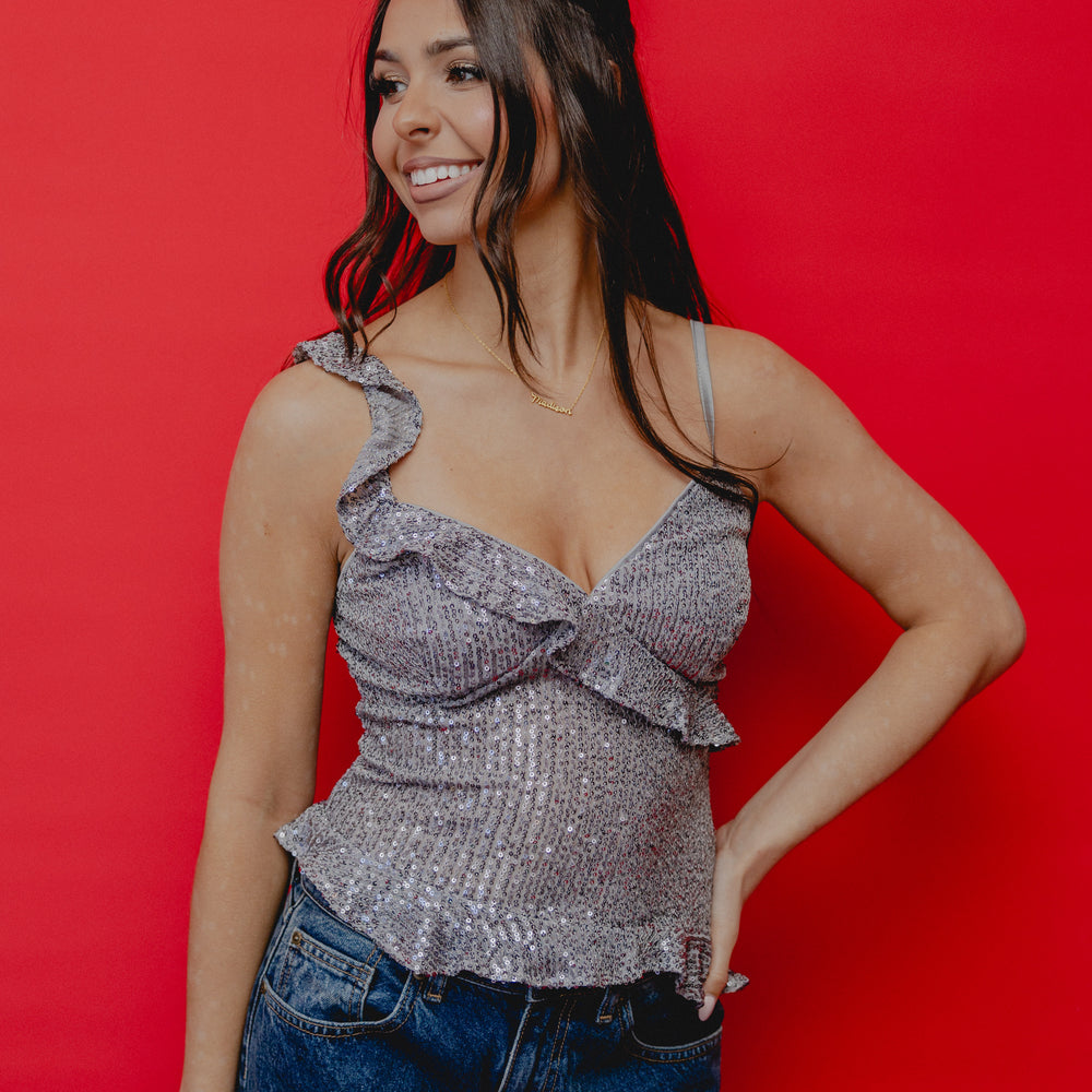 Dressed Up Sequin Ruffle Tank Grey
