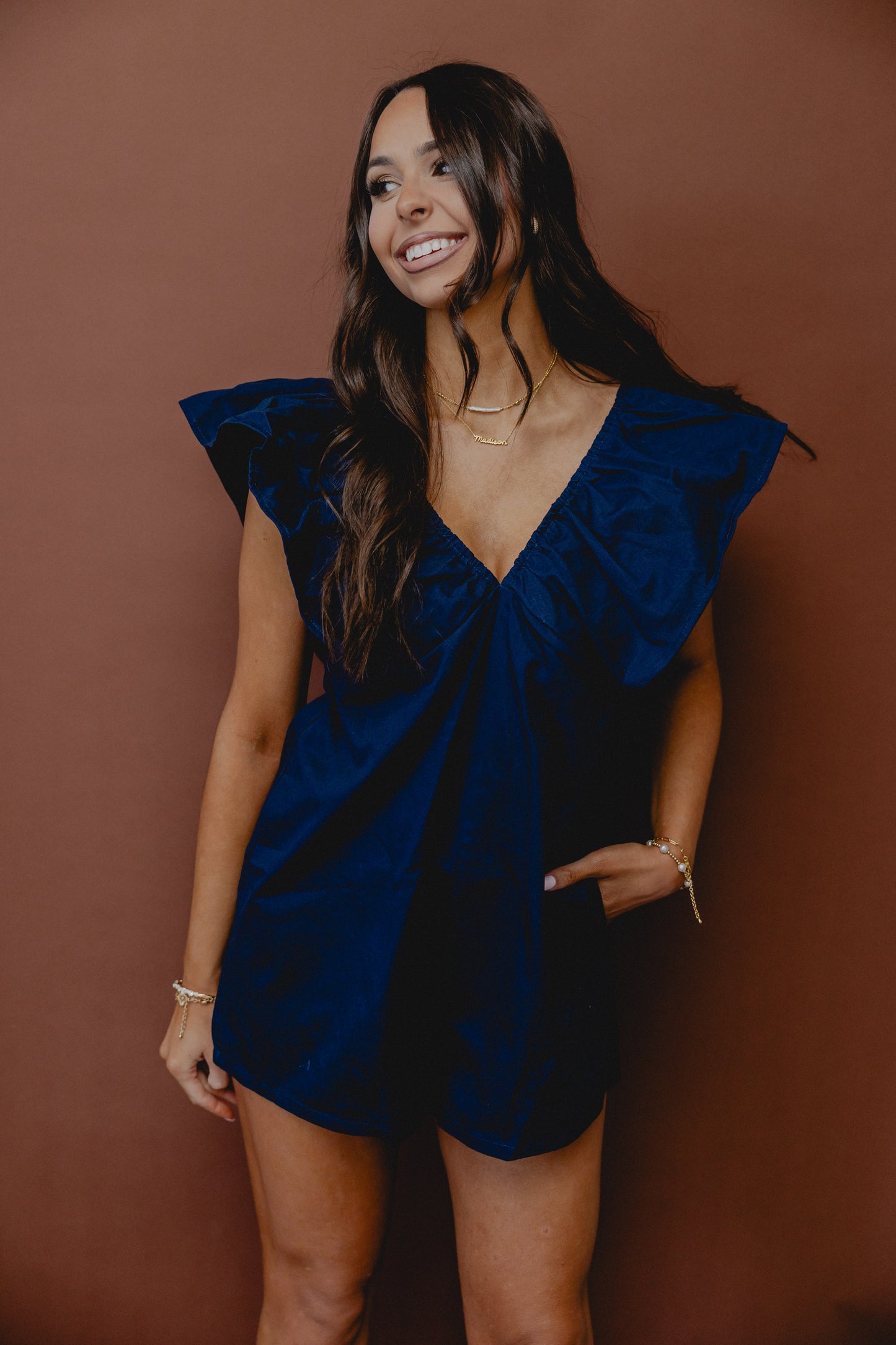 Unfamiliar Territory Ruffle Romper Navy