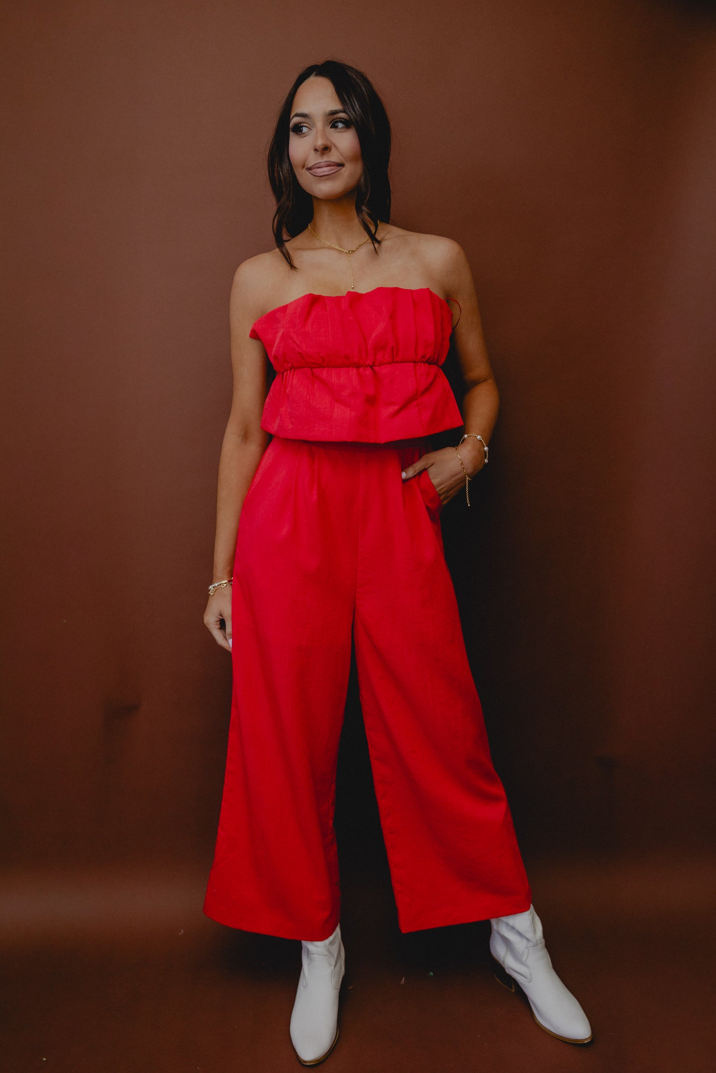 Breaking Even Ruffle Strapless Jumpsuit Red