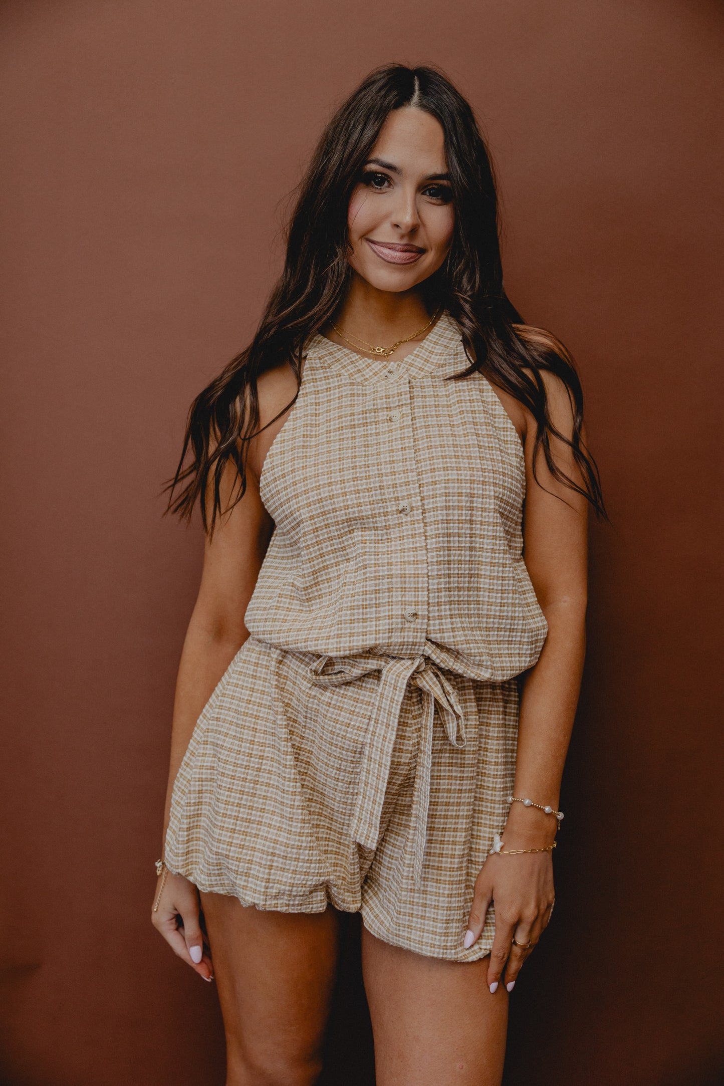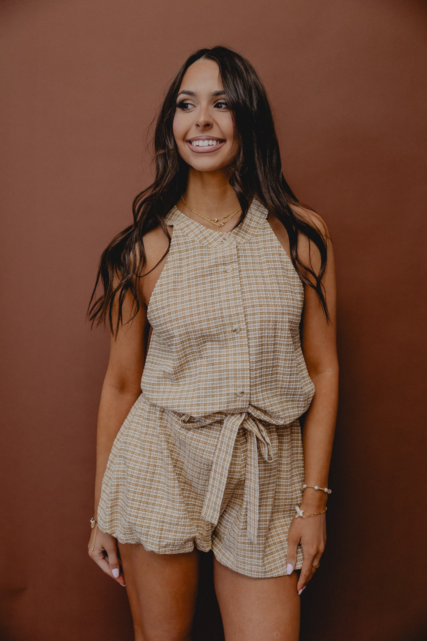 Split The Bill Plaid Romper Tan