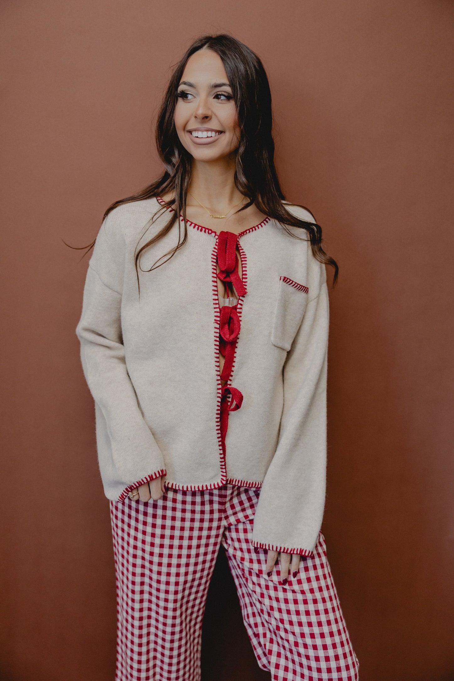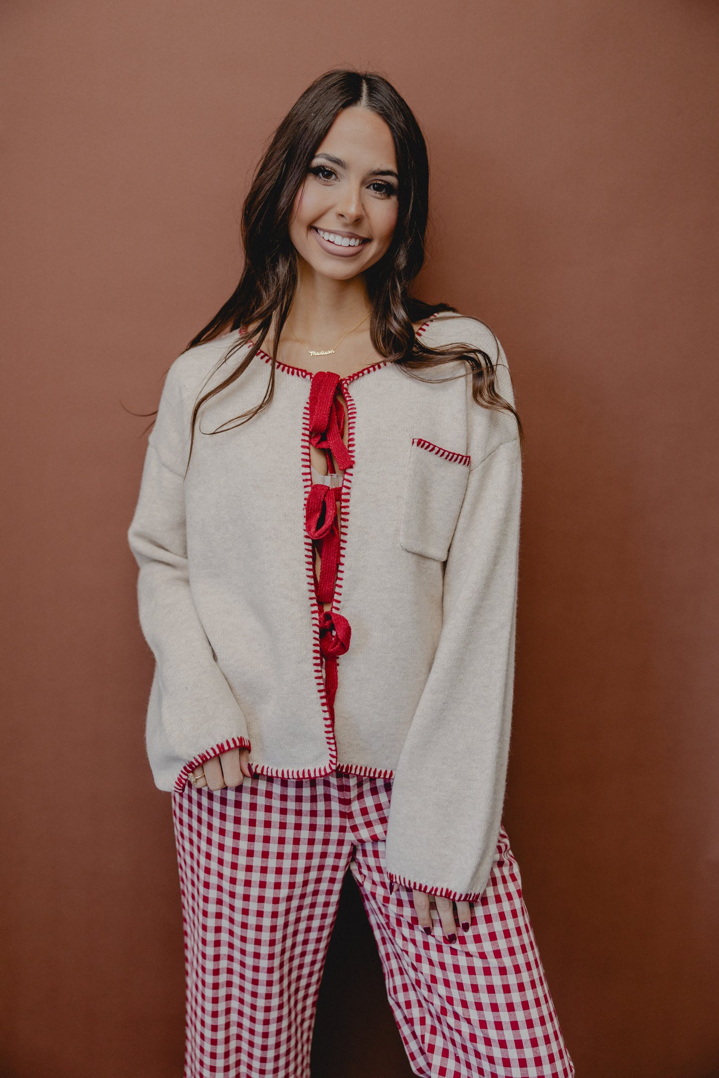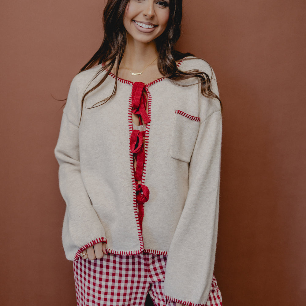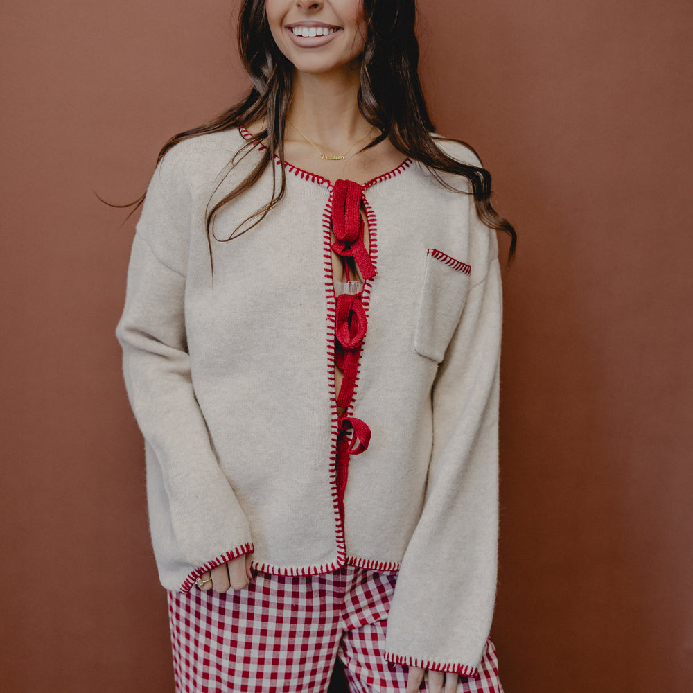 Faith In Me Contrast Tie Cardigan Cream/Maroon