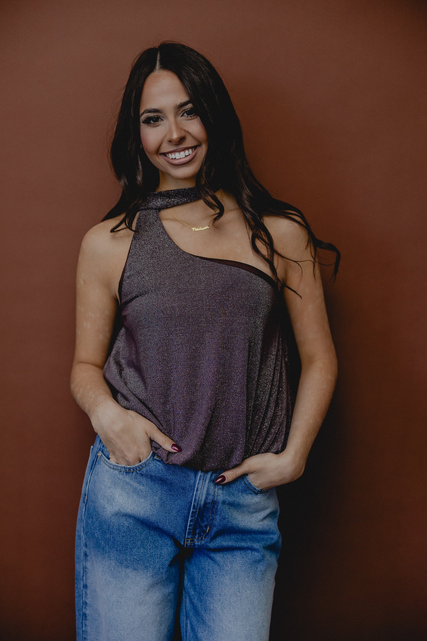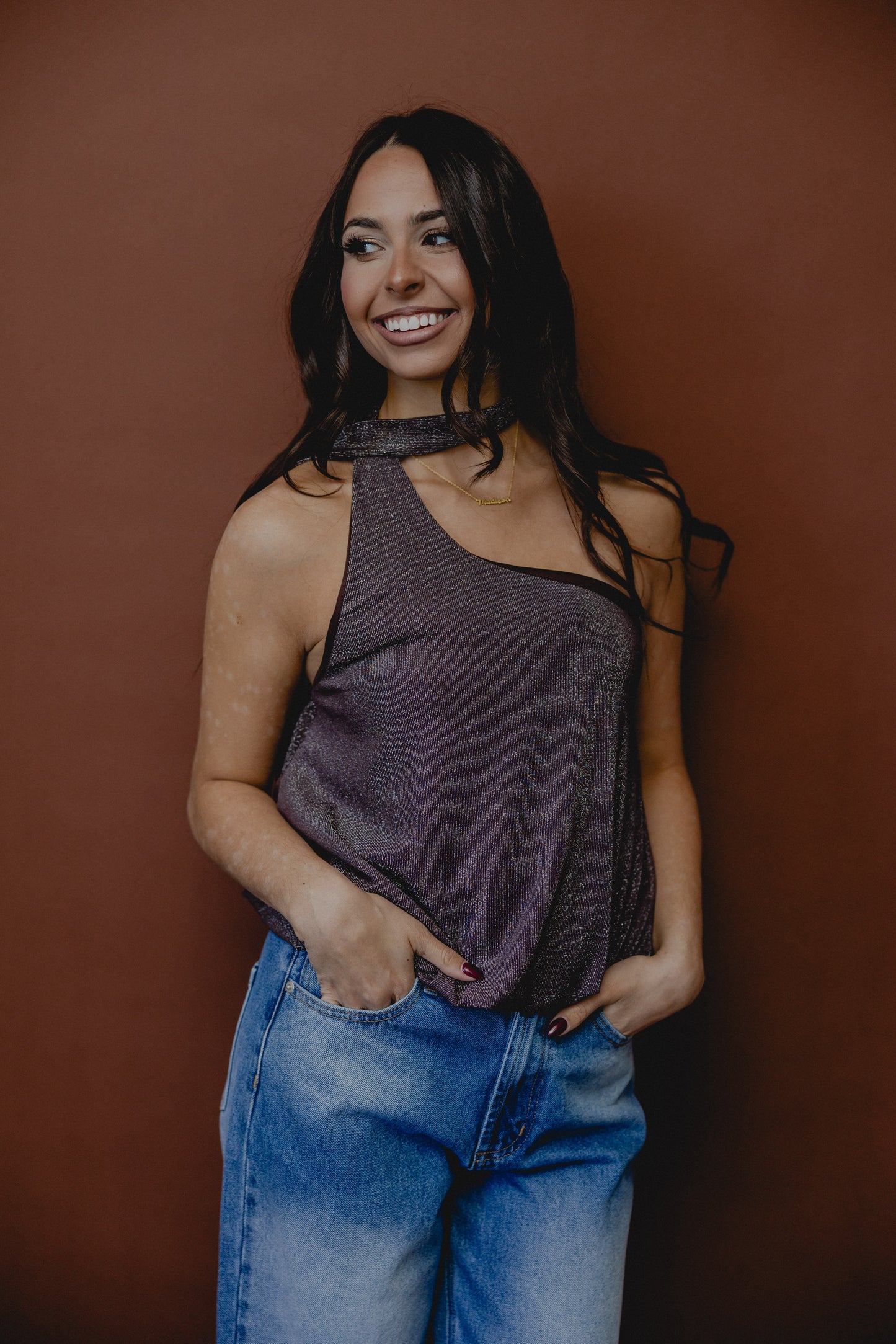 Just Me & You One Shoulder Scarf Top Brown